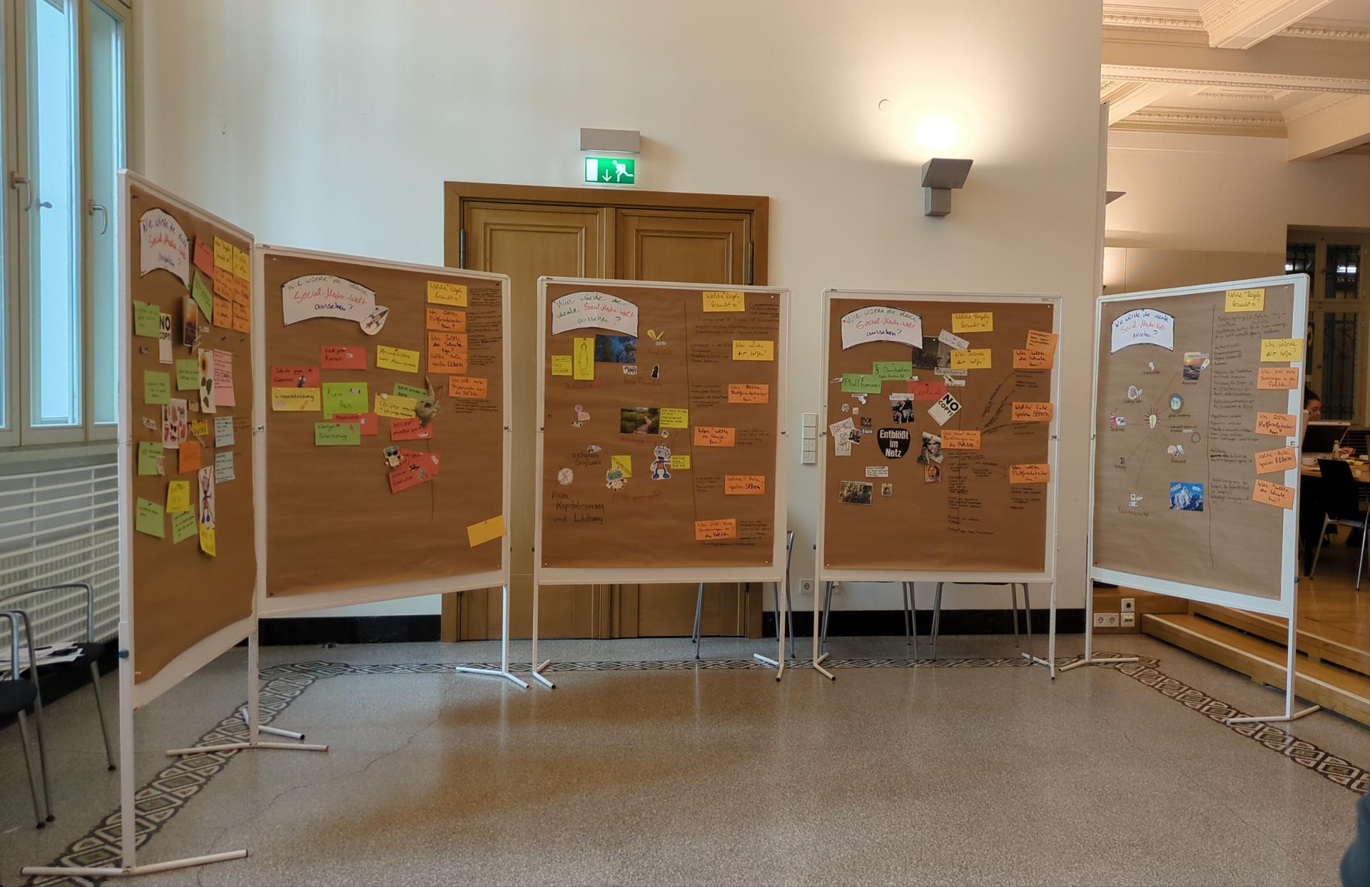 Zum Einstieg sollten wir alle aufschreiben, was uns an unserem eigenen Verhalten mit Social Media stört und was uns an Social Media generell stört. Anschließend wurden wir in Altersgruppen aufgeteilt und sollten im ersten Schritt eine Collage dessen erstellen, wie die ideale Social Media-Welt für uns aussehen würde, wenn keine der negativen Dinge mehr existieren würden. In diesen Gruppen haben wir dann konkrete Vorschläge und Forderungen an die Betreibender*innen, Politik, die Schule und Eltern formuliert.